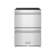 The RF24U is a 24-inch stainless steel refrigerator with 5.4 cu ft (152 L) of cooling capacity and two soft-close drawers, designed for both indoor and outdoor use. It features digital controls with blue LED display, convection cooling for consistent temperatures (34°F–46°F), adjustable leveling legs, and a quiet operation (~44 dB). The unit is available as built-in or freestanding, has an anti-fingerprint finish.