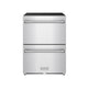 The RZ24U is a 24-inch undercounter freezer drawer designed for both indoor and outdoor use, with 5.4 cu ft (152 L) of capacity and two soft-close drawers for organized frozen storage. It features easy built-in or freestanding installation, convection cooling for quick and consistent temperatures, digital controls with blue LED display, and bright LED drawer lighting for visibility. A sleek anti-fingerprint stainless steel finish and adjustable leveling legs enhance both aesthetics and practicality, while quiet operation (~44 dB) keeps noise low.